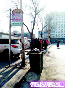 有关记者在现场看到,市民所反映的公交站牌位于东安路五一东街口北七八米处路东,站牌上写着“火车站”,并悬挂有73路和869路公交车的线路牌。站牌下果然放有两个深绿色的塑料垃圾桶,塑料垃圾桶桶内满是垃圾,并散发出阵阵恶臭。由于塑料垃圾桶存在的诸多缘故,等公交车的人都站在距离塑料垃圾桶四五米远的便道上等车。有些路人为了看站牌上的公交车行驶线路,不得不皱着眉头,捂着鼻子靠近塑料垃圾桶,看清后,就立即躲开。