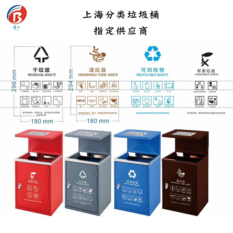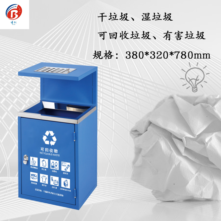 颜色:常规“红色有害垃圾”、“蓝色可回收垃圾”、“灰色干垃圾”、“绿色湿垃圾”颜色可以随意搭配